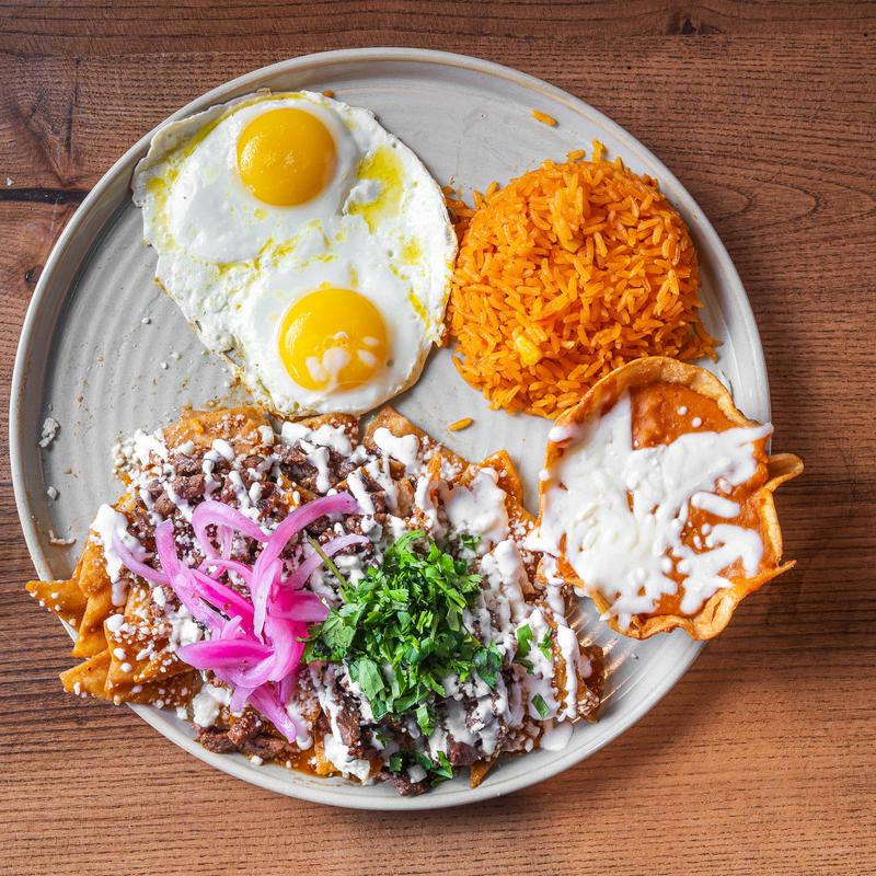 Chicken $20.75 | Steak $22.85 • Corn tortilla chips topped with green or red sauce, onion, sour cream, and fresh cheese, served with rice, beans, and eggs cooked to your preference.