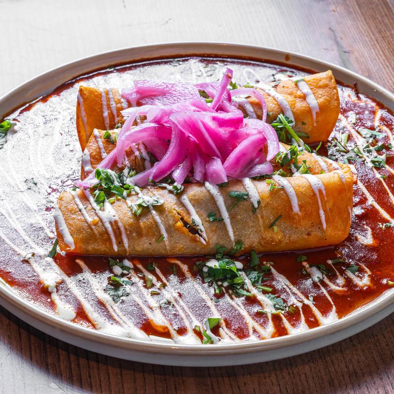 Four deep-fried rolled corn tortillas stuffed with your protein choice, topped with spring mix salad, sour cream, cheese, and house sauce. Served with rice and beans.