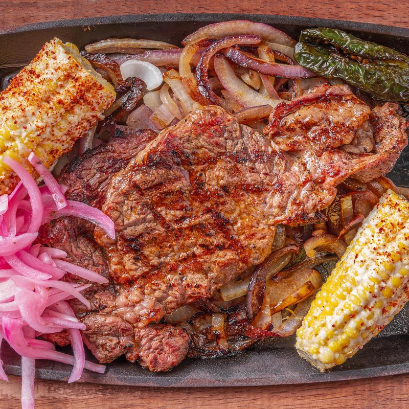 Rib-eye steak, chicken, and grilled shrimp cooked with chipotle, grilled onions, and chopped garlic. Served with Mexican street corn, beans, and tortillas.
