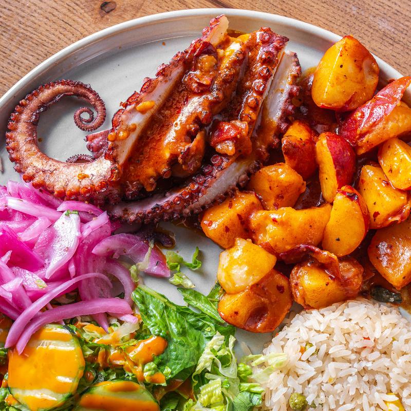 Grilled octopus served with rice, roasted potato, and a fresh spring mix salad.